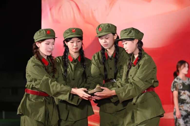 管理艺术学院二连带来校歌与《红军鞋》。一双红军鞋,承载着长征路上的峥嵘岁月;80双年轻的脚,正踏上“数字贸易+艺术赋能”的新长征路!