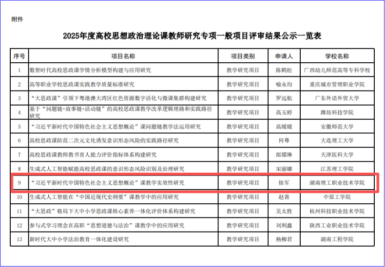 教育部高校思想政治理论课教师研究专项,是“高校哲学社会科学繁荣计划专项”的重要组成部分,该项目聚焦支持一线思政课教师深化教学研究、促进理论实践融通,切实增强思政课的育人实效与感染力。今年,全国范围内仅立项80项,竞争异常激烈。在此次遴选中,我校脱颖而出,为湖南高职在此次评选中争得一席之地,标志着我校思政课建设探索取得高质量突破。