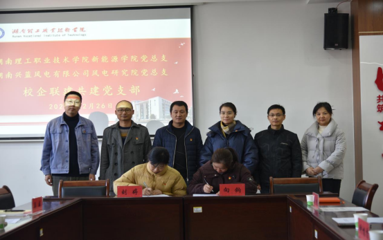 为深入贯彻落实新时代党的建设总要求,深化校企合作、产教融合,以党建引领人才培养与产业发展深度融合,12月26日,我校新能源学院与湖南兴蓝风电有限公司联建共建党支部签约暨揭牌仪式在新能源大楼举行。湖南兴蓝风电有限公司风电研究院党总支书记徐可、风电研究院机械系统党支部书记刘婷、风电研究院机械系统党支部党员刘中华、风电研究院工艺室主任吴威,我校新能源学院党总支书记向钠、省工程实验室主任钟根香、组织人事部副部长朱彬、风力发电工程技术专业带头人杨波出席会议。
