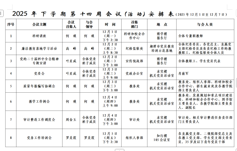 2025年下学期会议安排表(第十四周)