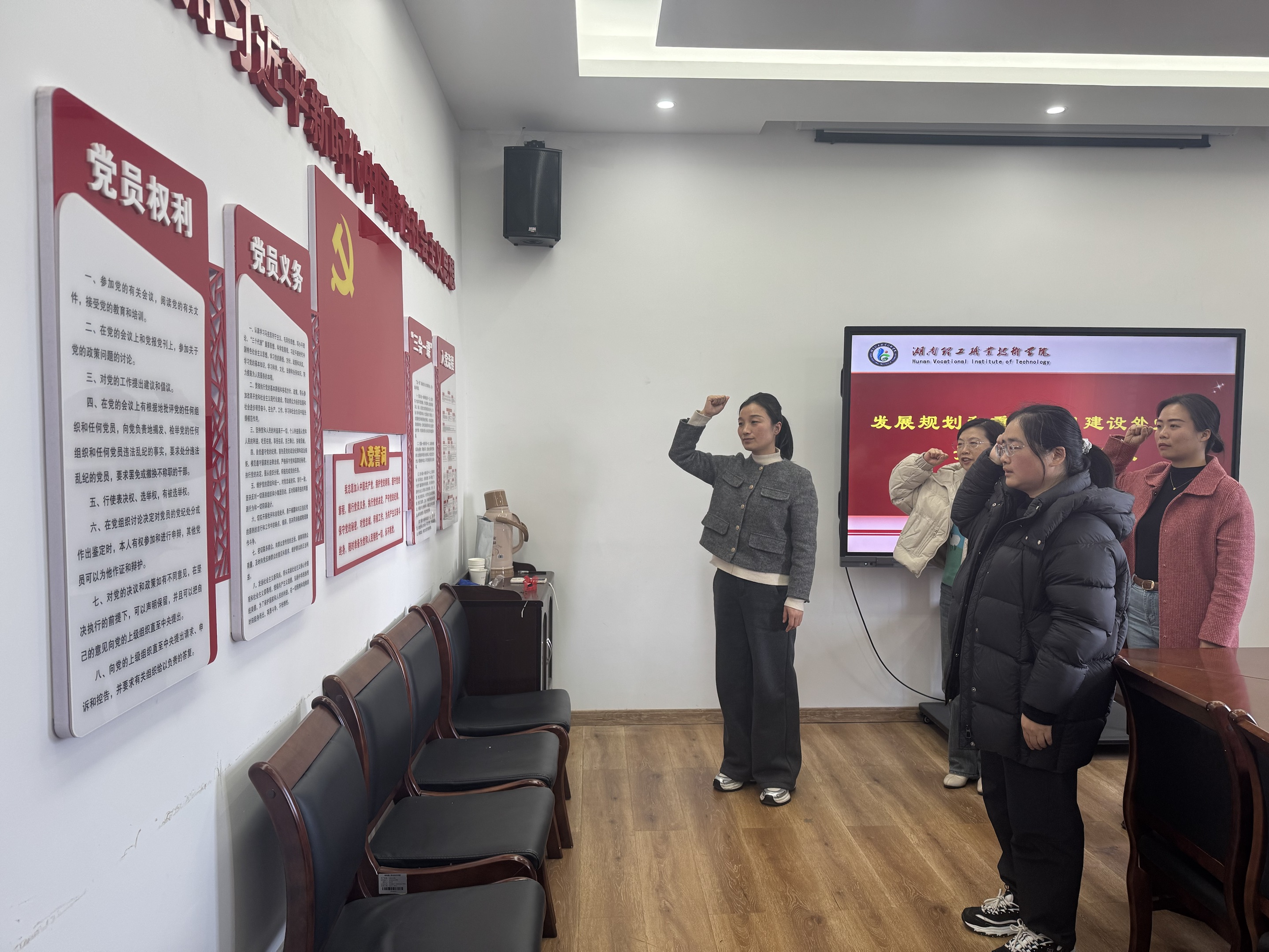 曹辉同志作表态发言。她表示,转正是政治生命的新起点,今后将始终牢记入党初心,持续加强理论武装,提升政治素养与业务能力,严守党的纪律,积极发挥党员先锋模范作用,在学习、工作与生活中勇担重任、甘于奉献,努力成为一名让党组织放心、让师生满意的优秀共产党员,以实际行动为党和人民的教育事业贡献力量。会议最后,全体党员面向党旗,庄严宣誓。“我志愿加入中国共产党……”铿锵有力的誓言回荡在会场,新党员以承诺筑牢信仰根基,老党员重温誓词再忆初心。