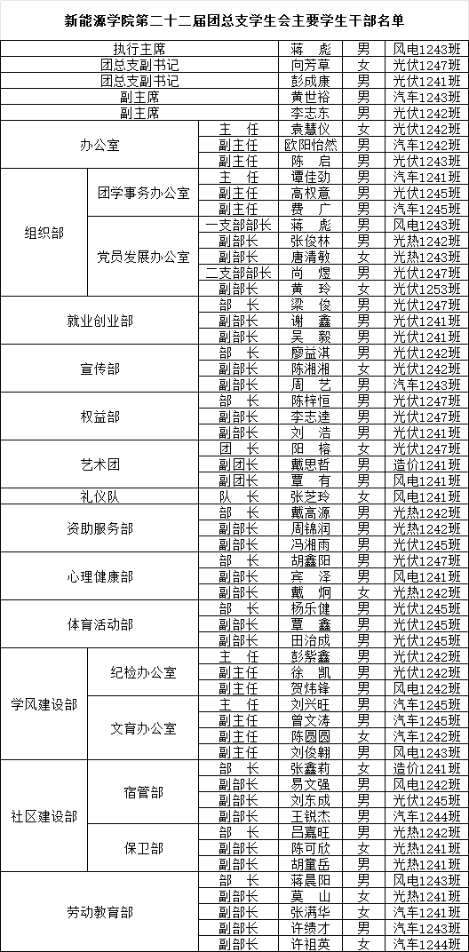 为进一步加强新能源学院学生干部队伍建设,充分发挥“组织青年,引领青年”的作用,经资格审查、面试、综合考察等环节,现将第二十二届团总支学生会主要学生干部拟任用名单予以公示: