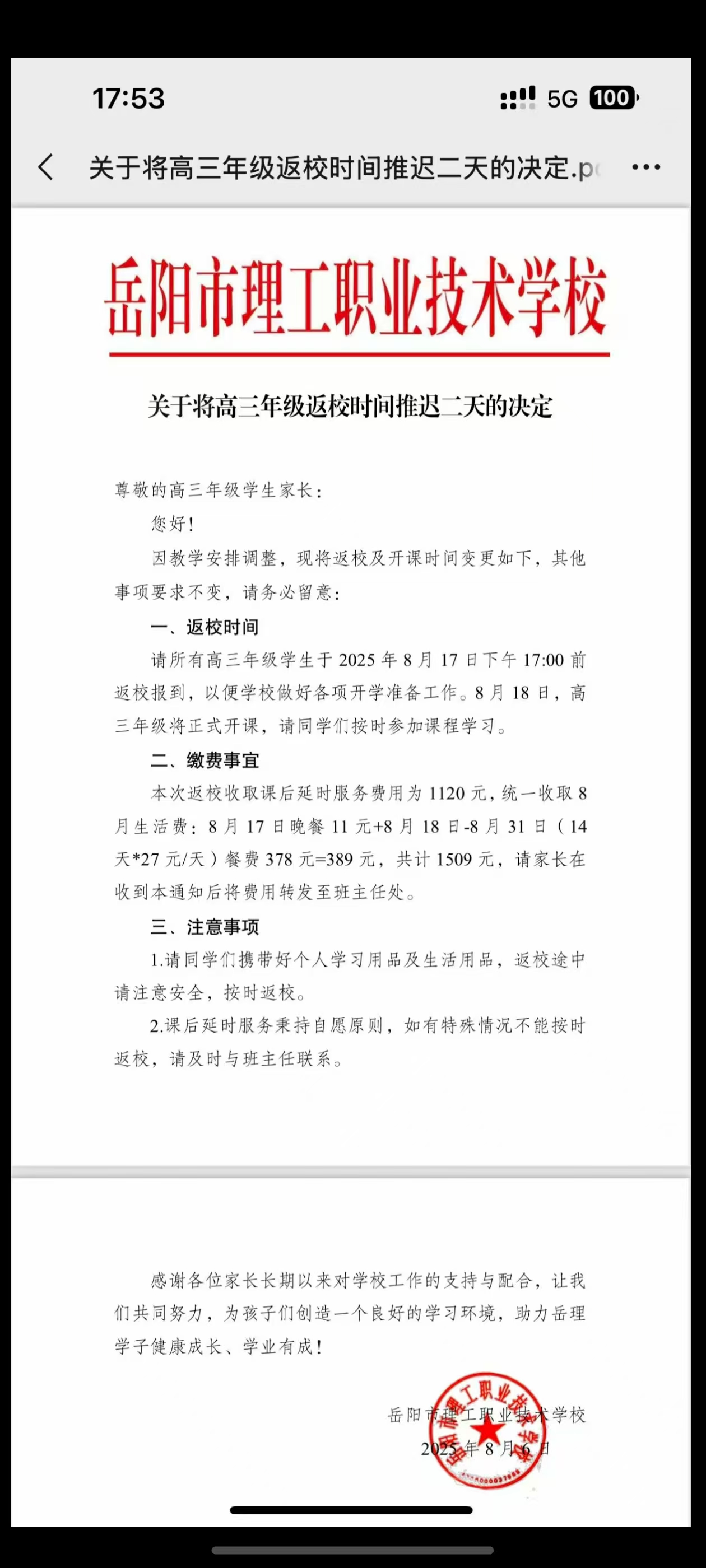 反映湖南理工职业技术学校通知学生8月17日下午去学校补课,收取课后延时服务费用为1120元,统一收取8月生活费:8月17日晚餐11元+8月18日-8月31日(14天*27元/天)餐费378元=389元,共计1509元,。学校不顾还是暑假期间,要求学生补课,收取费用,加重家庭负担和学生的学业负担。请核实处理。 附件1:111.jpg |